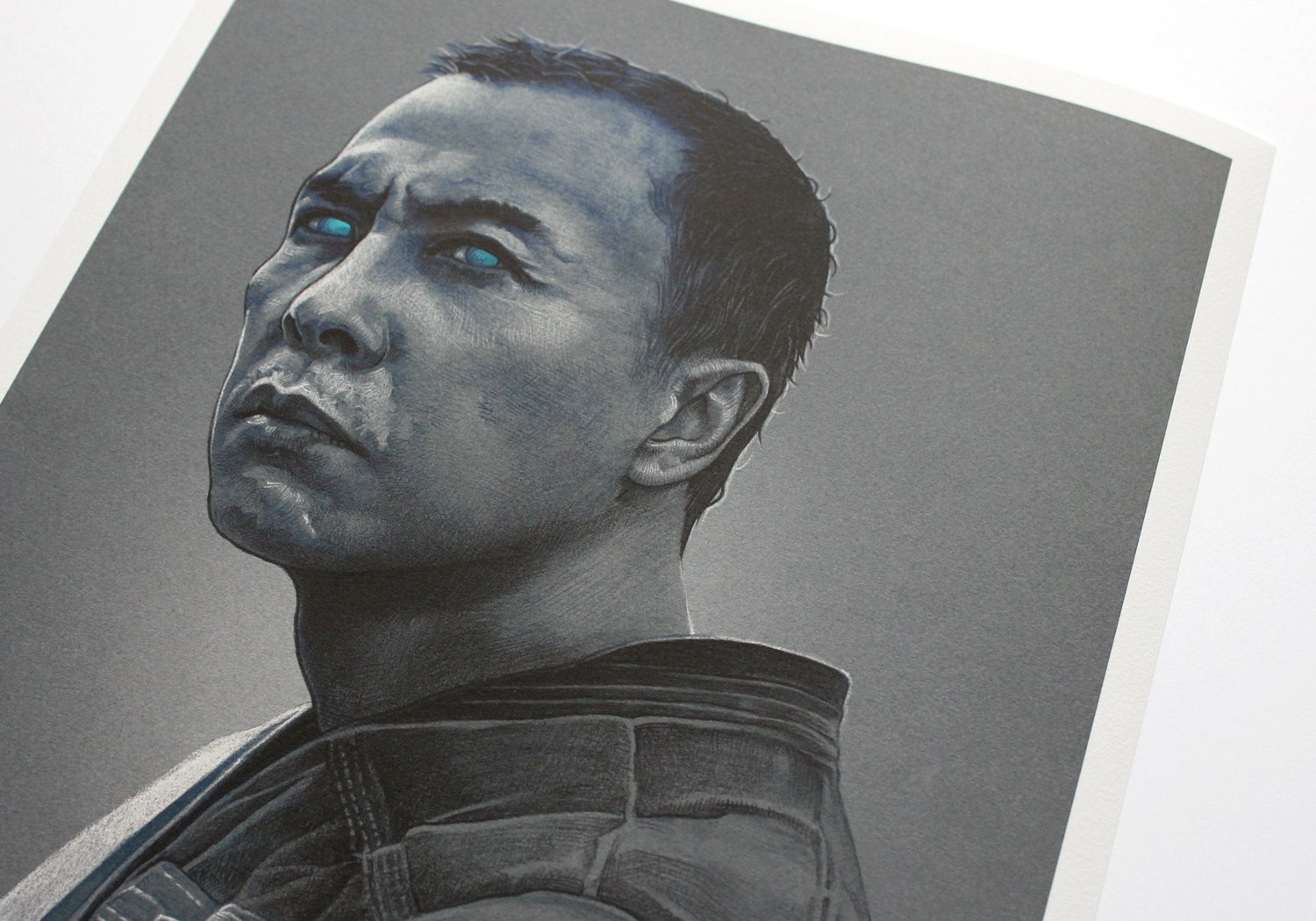 Limited edition Fine Art Giclee prints inspired by the Star Wars characters. Chirrut Îmwe: One of the Guardians of the Whills, an order of spiritual warrior-monks, active during the days of the Galactic Empire. Became part of a volunteer group of Rebels tasked with stealing the plans of the first Death Star.. Watercolor pencil drawing remastered in Adobe Photoshop. Regular and Variant versions printed by Bottleneck Gallery. Each print comes signed and numbered.