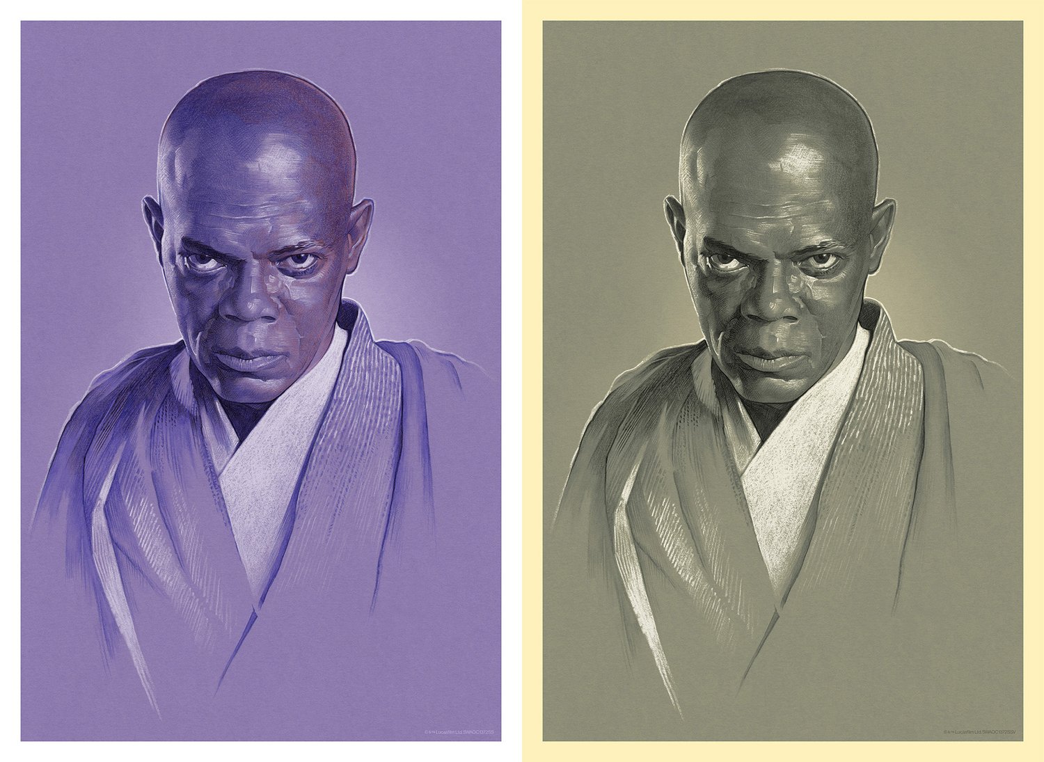 First in the series of limited edition Fine Art Giclee prints inspired by the Star Wars characters: Sam Jackson as "Mace Windu". Watercolor pencil drawing remastered in Adobe Photoshop. Regular and Variant versions printed by Bottleneck Gallery. Each print comes signed and numbered.