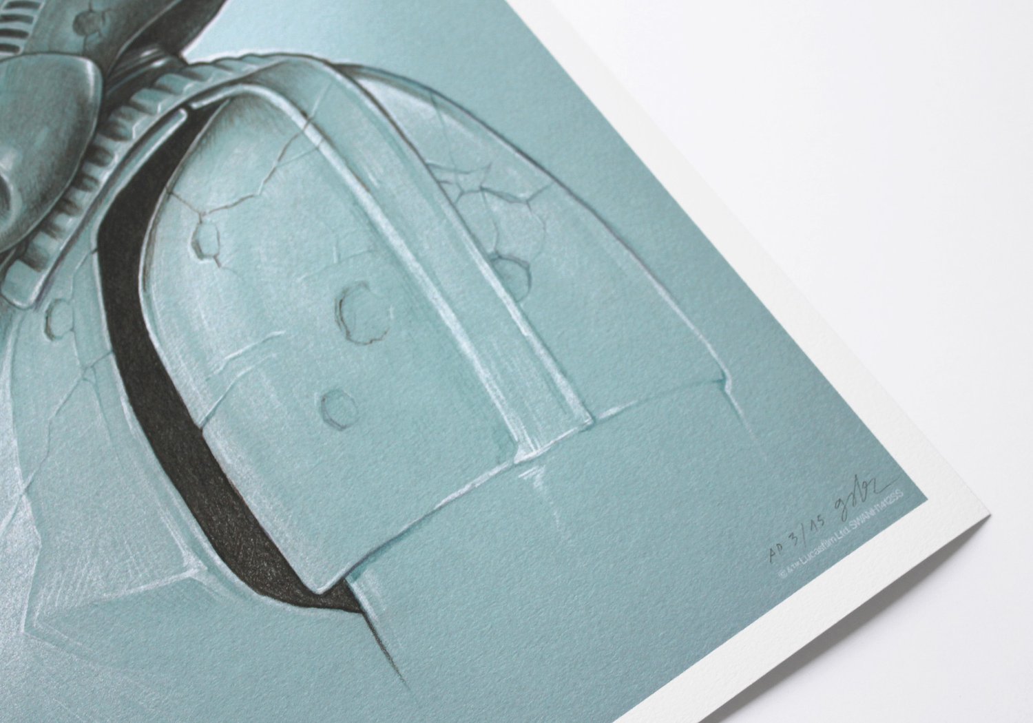 Limited edition Fine Art Giclee prints inspired by the Star Wars characters. Battle damaged Strom Trooper. Watercolor pencil drawing remastered in Adobe Photoshop. Regular and Variant versions printed by Bottleneck Gallery. Each print comes signed and numbered.